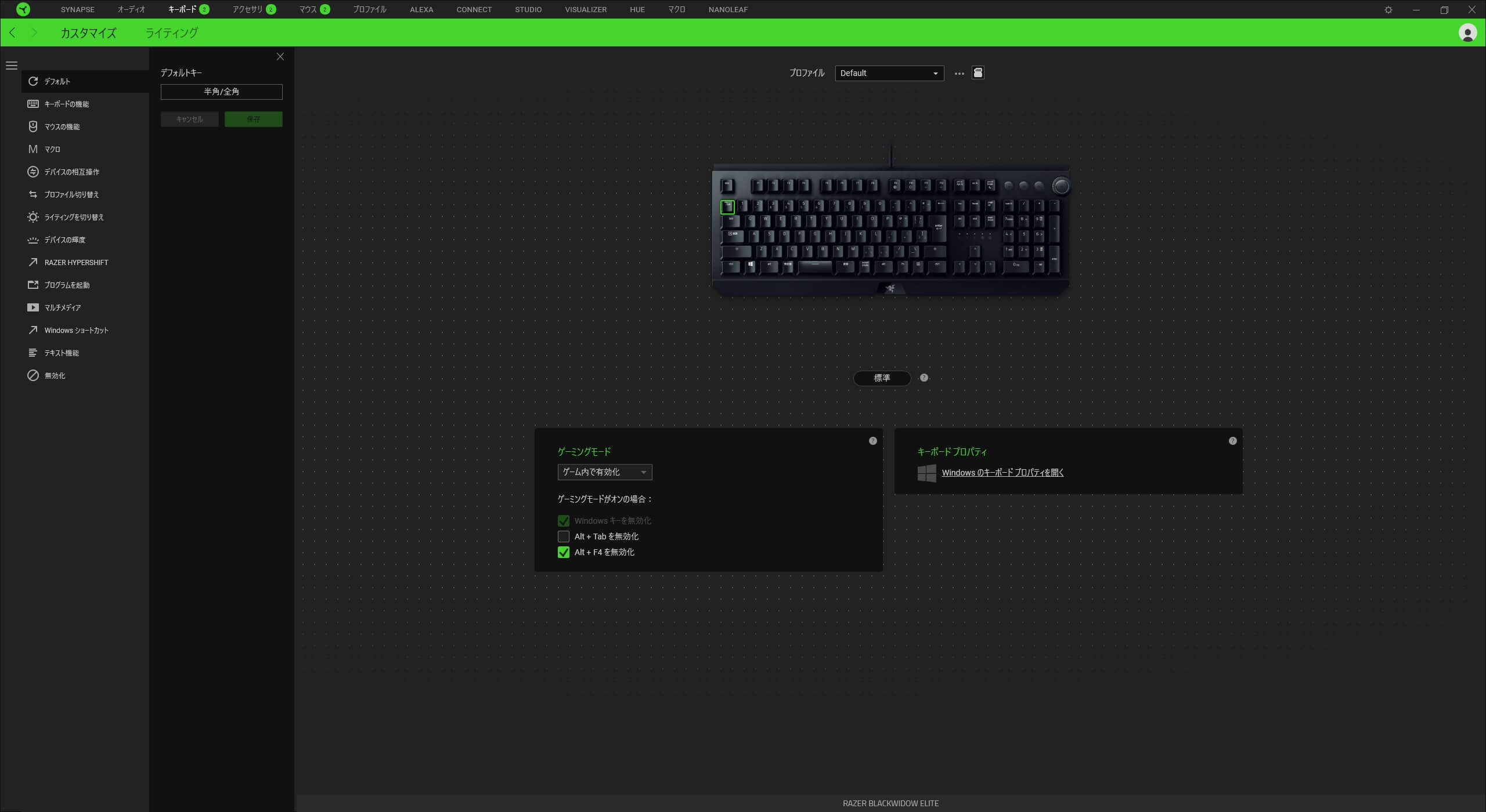 キーごとに自由に設定が可能となります。まずプロファイルに「Default」と「Game」の2つ作成し、仕事で使用するときは「Default」、ゲームで使用する際は「Game」にプロファイルを変更しています。
