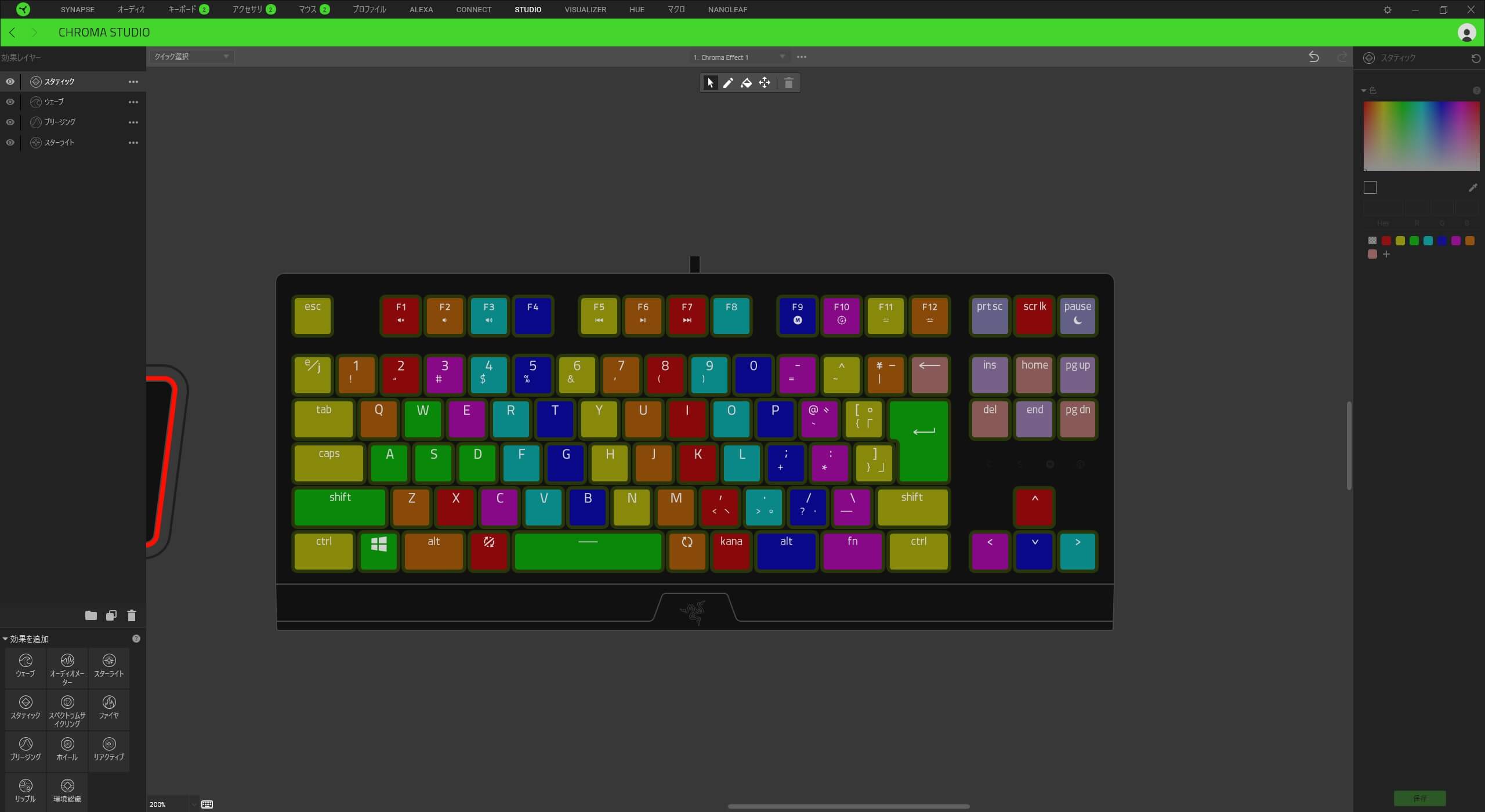 今回は「スタティック」で各キーごとにカラー設定をしてみました。